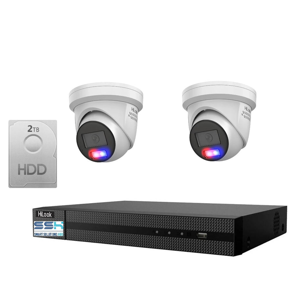 Hikvision HiLook All-in-One Camera with Active Colour Deterrence 4CH CCTV Kit: 2 x IP Active Colour Camera + 4CH NVR